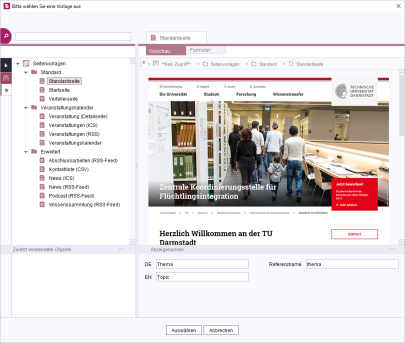Die zur Verfügung stehenden Seitenvorlagen gewährleisten, dass alle Webseiten im Corporate Design der TU Darmstadt erscheinen. Sie bilden sozusagen die „leere Hülle“ für eine Seite und legen deren Erscheinungsbild fest.