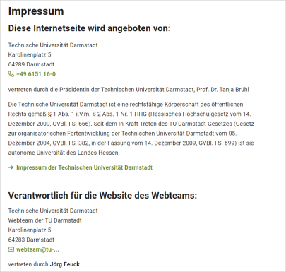 Absatzvorlage zur Darstellung des Impressums von Institutionen und Einrichtungen der TU Darmstadt.