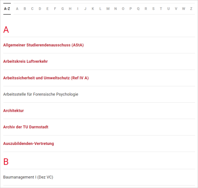 Diese Absatzvorlage ermöglicht es, eine A-Z-Liste von Institutionen aus der Datentabelle Einrichtungen der Datenquelle Kontakt auszugeben.