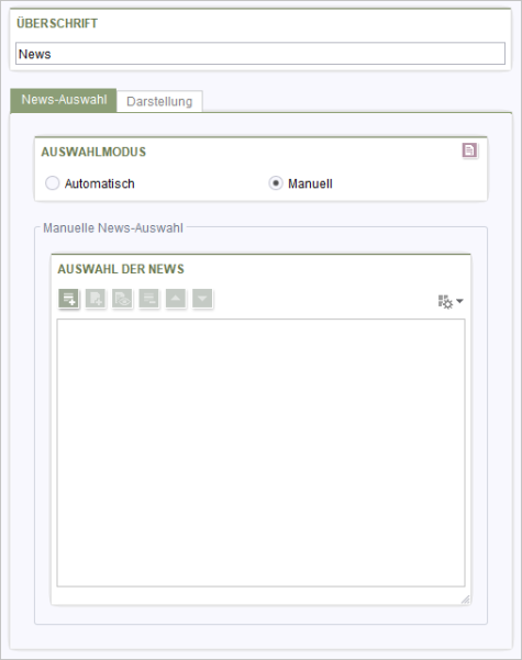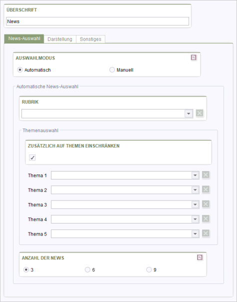 Es kann zwischen zwei Modi gewählt werden, abhängig davon, ob automatisch die aktuellsten News oder aber manuell spezielle News angeteasert werden sollen.
