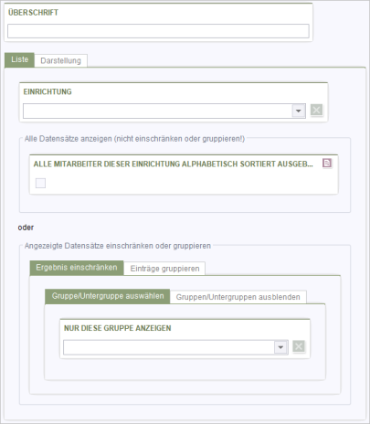 Die auswählbaren Einrichtungen entsprechen den Einrichtungen, die in der Datenquelle “Kontakte” in der Tabelle “Einrichtungen” eingetragen sind. Jeder Kontaktdatensatz, der in der Tabelle “Kontakte” eingetragen wird, muss zu mindestens einer Einrichtung angehören, um auf einer Webseite angezeigt werden zu können. Mehr hierzu erfahren Sie unter Kontakt erstellen.