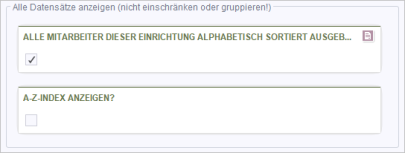 Wird dieses Feld aktiviert, so wird die vollständige Liste der Kontaktdatensätze der gewählten Einrichtung alphabetisch sortiert ausgegeben.