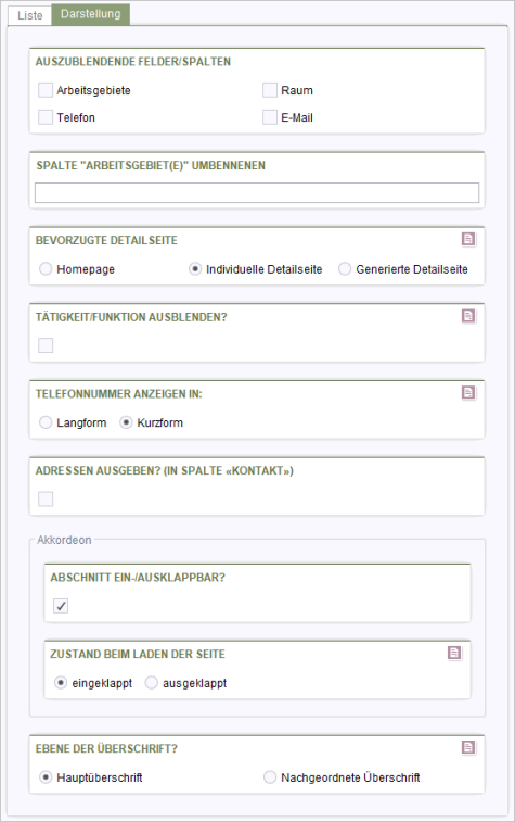 Hiermit können Sie den Spaltennamen für “Arbeitsgebiet(e)” selbst festlegen. Da hier gerne auch Projekte o. Ä. verwendet werden, kann dies redaktionell angepasst werden.