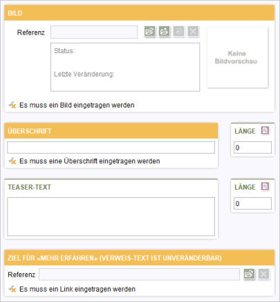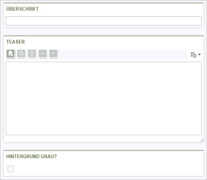 Fügen Sie hier mittels der Icons über der Auflistung Teaser-Elemente hinzu, löschen Sie diese oder verändern Sie die Reihenfolge.