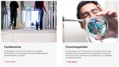 Dieser Teaser kombiniert untereinander Bild, Überschrift und längeren Einleser und schließt mit einem Link ab. Der Text selbst ist mit einer grauen Fläche hinterlegt, welche die Auftrittsfarbe annimmt, wenn die Maus darüber bewegt oder geklickt wird.