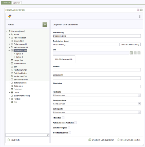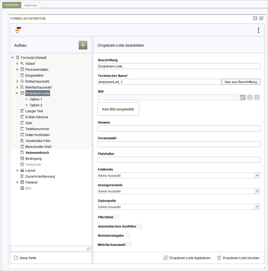 Wenn Sie die Nutzer:innen zwingen möchten, eine Auswahl zu treffen, so legen Sie an erster Position eine Option mit dem Wert “EMPTY_VALUE” an und definieren diese als vorausgewählt. Zusätzlich legen Sie bei der Auswahl fest, dass diese ein Pflichtfeld ist. Trifft die Person jetzt keine Wahl, wird bei der Validierung ein Fehler angezeigt.