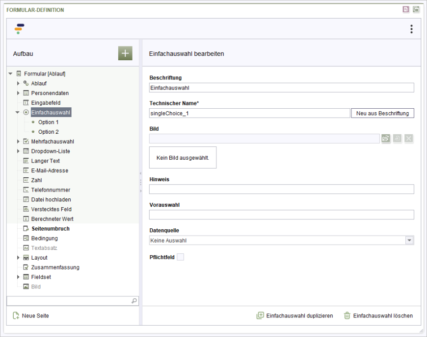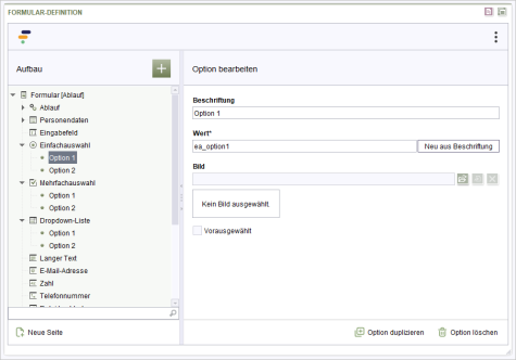 Hiermit kann festgelegt werden, welche Option beim Laden des Formulars vorausgewählt ist. Diese wird auch als Wert verwendet, wenn der Nutzer keine andere Option auswählt.
