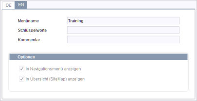 Für die Menüebene kann der Menüname (dieser entspricht dem Text, der online auf dem Menüpunkt der Navigation angezeigt wird), Schlüsselworte und Kommentare übersetzt werden.