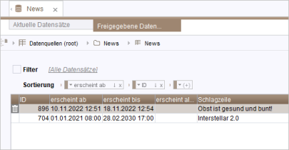 Im Folgenden wird das korrekte Vorgehen anhand von News erläutert. Diese Beschreibung lässt sich jedoch auf alle Datenquellen anwenden, also News, Kontakte, Glossareinträge, Globale Absätze usw.